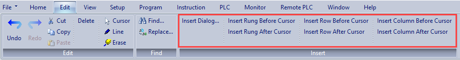 The Insert Selection on the Edit Menu provides six handy ways to add space within the Ladder Program to add Contacts, Coils, or Box Instructions. The six versions of the Insert command each add one of the following: