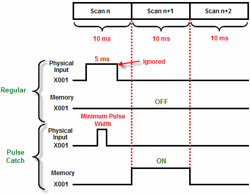 Click on the respective Input Pulse Catch selection to set the specific Input to Pulse Catch. Pulse Catch mode of operation allows the ladder program to see an Input Pulse that is shorter in duration than the current scan time. The circuit latches the Input event on the selected Input for one scan and turns OFF after the scan.