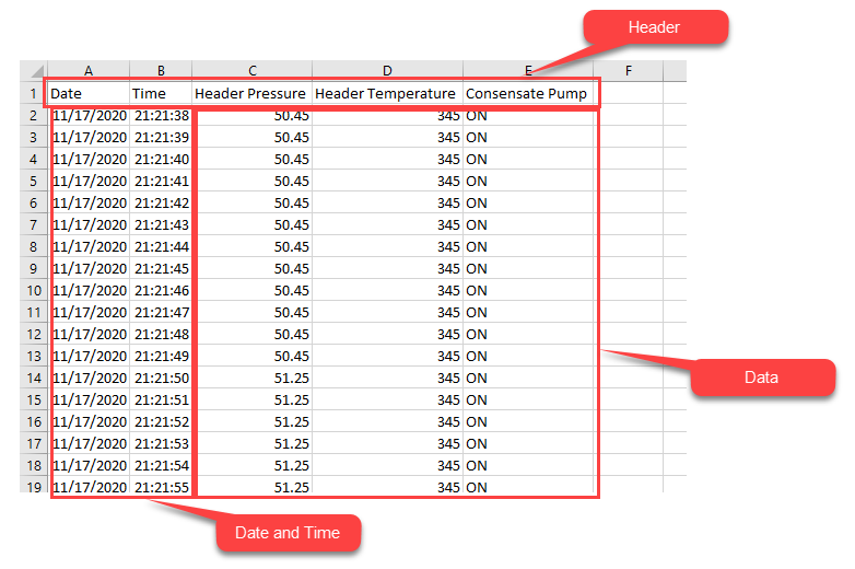 Time: Same as the Date header, this text can be edited, But this column represents the time the data point is logged. There is only one format : HH:MM:SS.