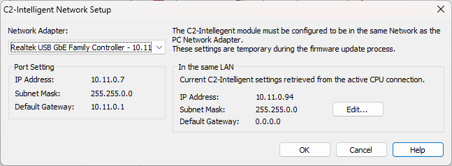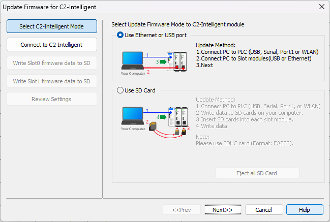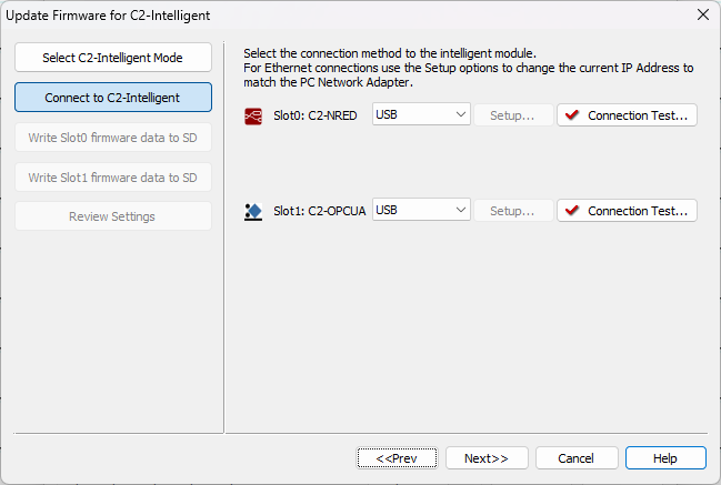 Select Ethernet or USB as the connection method between your PC and the C2-Intelligent module.