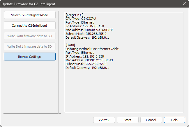 Check the connection settings that will be used for the firmware update, then click Start to proceed.