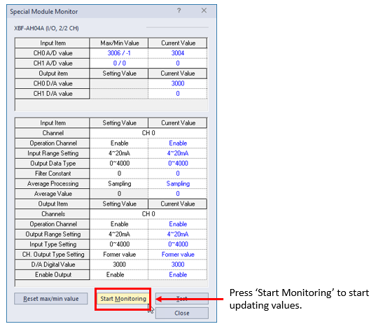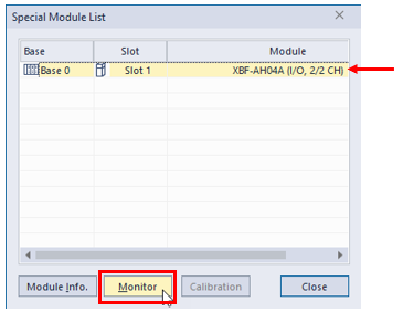 Select the module to monitor and press the Monitor button. This example shows an XBF-AH04A module.
