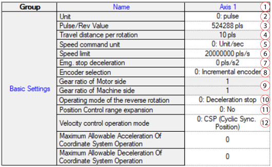 | 9 | Origin driving Acc/deceleration | Set the acceleration/deceleration of the homing operation. |