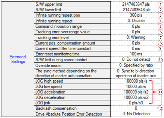 | 7 | Tracking error level | Set the behavior for a position deviation error. Warning or Servo alarm are the options. |