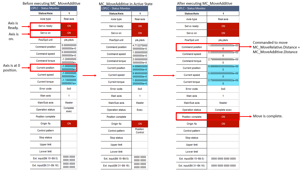MC_MoveAdditive is used to add a distance to an active motion command for an axis. This function block should be executed when axis is in DiscreteMotion state. MC_MoveAdditive can be executed without the axis being homed.