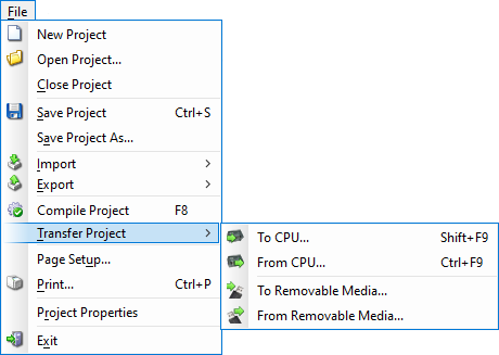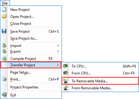Note: CPUs without a built-in display do not allow project transfer from Removable Media. If using a CPU without a built-in display, the Transfer Project To Removable Media… option will be grayed out in the software.