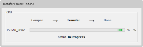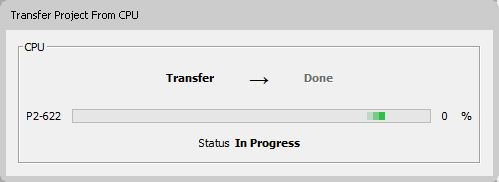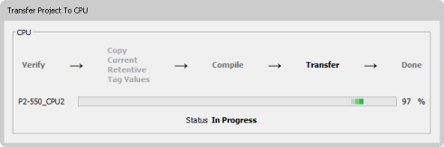 Open a project and select "To CPU" from the Transfer Project menu. The project will then be Transferred to the CPU from the PC. During the transfer, one of two status windows will appear. The dialog shown below will appear for all Runtime transfers or for Stop Mode transfers when "Copy current retentive tag values to initial values" is not checked. This option is located on the Options window, which is accessed from the Tools > Options > Project Transfer.