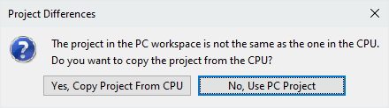 If you select "Yes, Copy Project From CPU", the project in the CPU will be Transferred from the CPU to the PC.