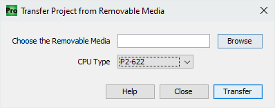 Transfer Project allows Transfer of saved projects in the Productivity Suite software to the CPU or to a Removable Media device. It also allows Transfer of projects from the CPU or a Removable Media to the Productivity Suite software.