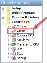 Selecting Online will connect to the last known controller that was connected to the PC. If no prior connection was made, you will access the CPU Connections browser. This will show you a list of ALL available CPUs within your network.