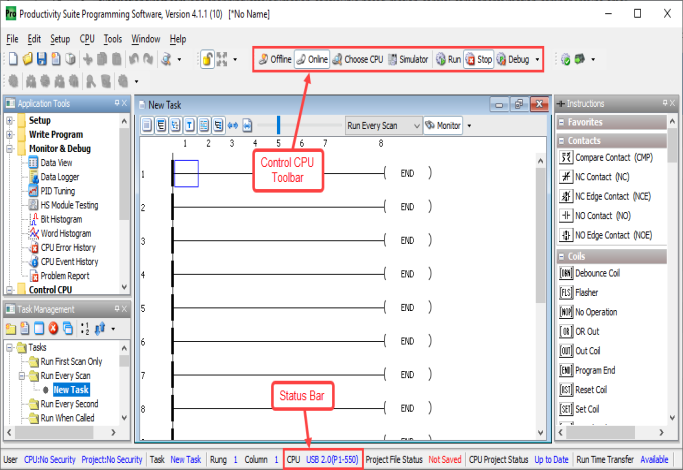 The Online condition is indicated on the Status Bar located at the bottom of the Main Screen as well as the Online Icon on the Control CPU Toolbar. The Status Bar also provides the CPU USB or IP Address and User Assigned CPU Name.