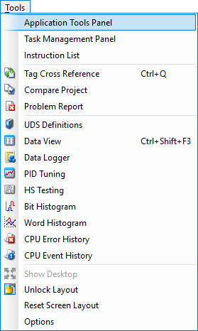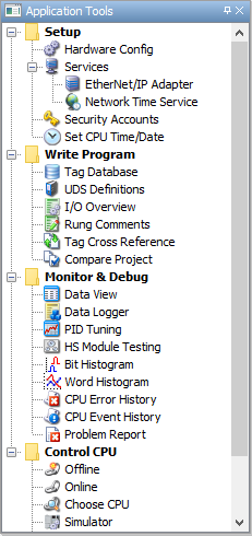 The Application Tools Panel allows the user to set up the CPU hardware and security, write/edit the project Tag Database, manipulate data obtained by the CPU and control the CPU operation.