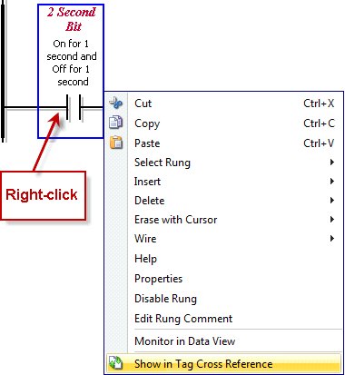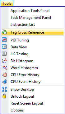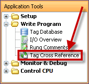 The Tag Cross Reference can be accessed by selecting Tag Cross Reference from the Tools Menu of the Main Menu, by selecting Tag Cross Reference from the Write Program topics of the Application Tools panel, by using shortcut Ctrl + Q, or by right-clicking an instruction or rung in ladder.