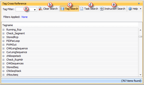 The Tag Cross Reference provides a list of tags used in ladder that can be filtered to show a specific name, task location or instruction usage information.
