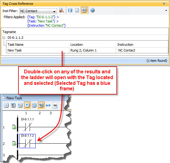 Example: You can have all three filters applied to a specific tag(s). In the example below we are going to search all the tags on rung 4 with DI-0.1.1.2 tag filter, New Task task filter and NC instruction filters applied.