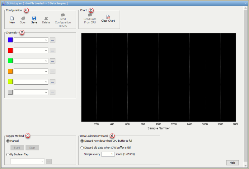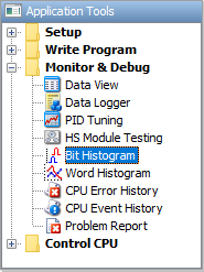 The Bit Histogram monitors and charts the status of Boolean Tags (bits). Bit Histogram can collect 2,000 samples of up to six tags as often as once per scan. The samples are collected in the CPU and later retrieved for display in the Bit Histogram chart.