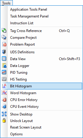 Select the Bit Histogram menu item from the Tools Menu, located on the Main Menu and shown to the right.