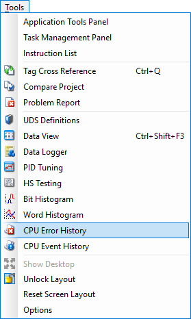 Select the CPU Error History menu item from the Tools Menu, located on the Main Menu and shown below.
