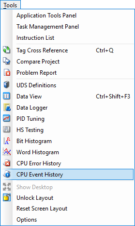 Select the CPU Event History menu item from the Tools Menu, located on the Main Menu and shown below.