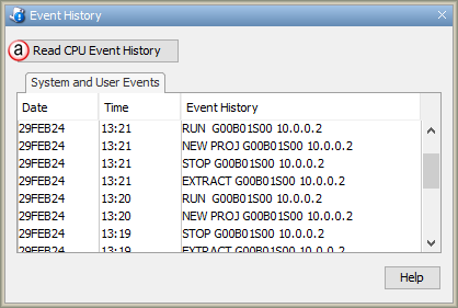 CPU Event History allows viewing of logged Boolean Tag events. The Tag must have an off-to-on transition to be logged. The Event History window displays the 18 most recent events. Events are configured using the Data Logger. The Event History can be logged to a USB drive attached to the CPU and can log as many events as the drive memory allows. See Data Logger.