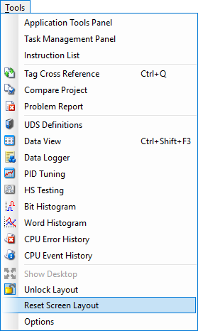 Reset Screen Layout is accessed from the Tools Menu selection of the Main Menu.