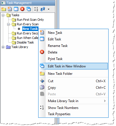 The New Window and Edit Task in New Window options provide the user with the ability to duplicate an existing Task in a New Window displayed in the Ladder Editor.