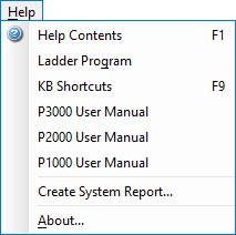 The Help Menu provides quick access to the software Help Contents, Help topic for building a Ladder Program, a list of Keyboard Shortcuts and the Software version with Contact information. The Help Menu is located on the Main Menu. When the user clicks on the Help Menu, a drop down menu opens.