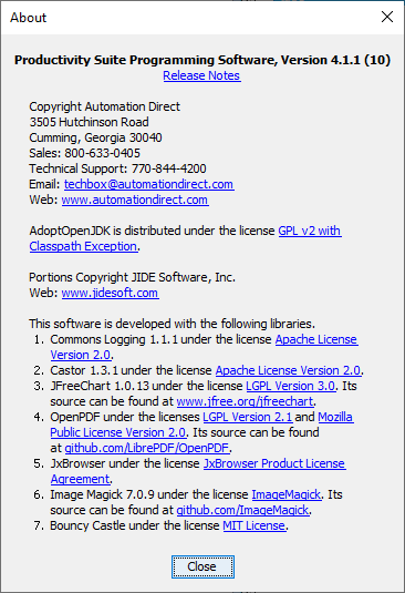 The About window provides the Productivity Suite Software version number and AutomationDirect contact information.