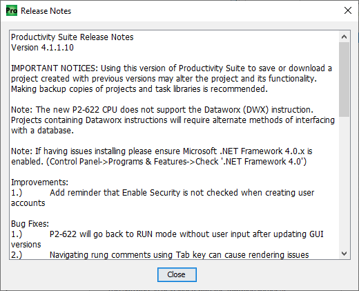 Click on the Release Notes link to display the notes associated with the Productivity Software version.