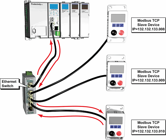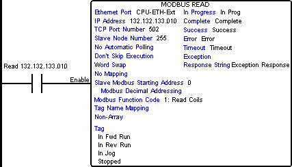 In the following example, the CPU Ethernet Port is performing a Modbus TCP Read of four consecutive status coils from a Modbus TCP Slave device.