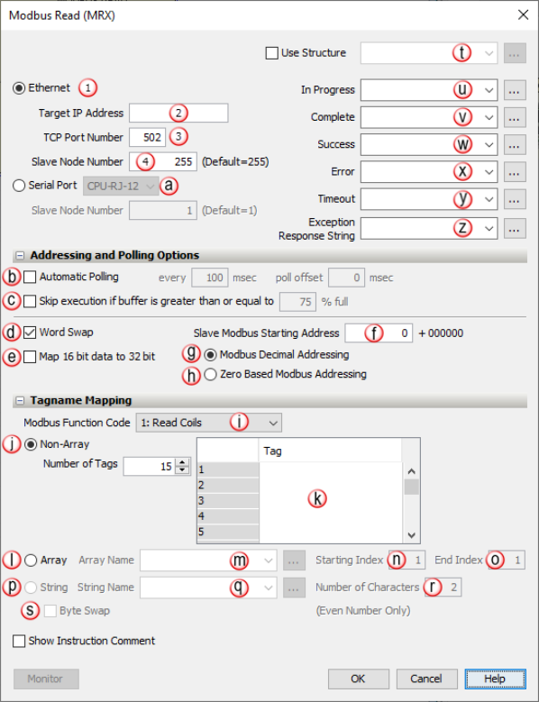 Allows the user to select the starting Tag and sequential number of Tags the data will be Read into in the Modbus Request. |