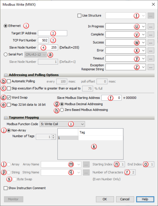 Note: Communications using this instruction are performed through the External Ethernet Port on the CPU (upper (P3) or forward (P2) Ethernet Port), the RS232 Port on the CPU (RJ12 Port), the RS485 Port on the CPU (3-pin Terminal Block). Uses Modbus based protocol exclusive to the P1-Series CPUs.