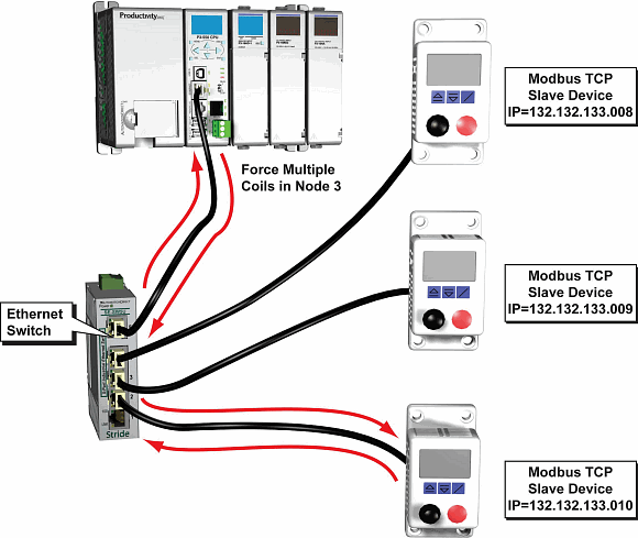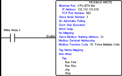 In the following example, the CPU Ethernet Port is performing a Modbus TCP Write to four consecutive control coils in a Modbus TCP Slave device.
