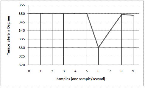 After the fifth sample, the oven door is opened and an item is placed inside. This causes a drop of 20˚F in our actual temperature which is seen at sample six. Therefore, the error in the system at sample six is calculated to be: e(6) = SP-PV = 350 - 330 = 20. Also, at this point the sum of all the sample errors for the system will equal: