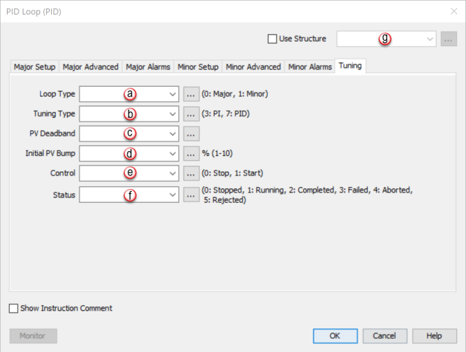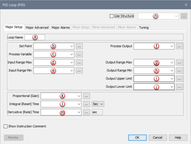 When PID Loop Instruction is selected the PID Loop Configuration window shown below opens with the Major Setup Tab opened by default.