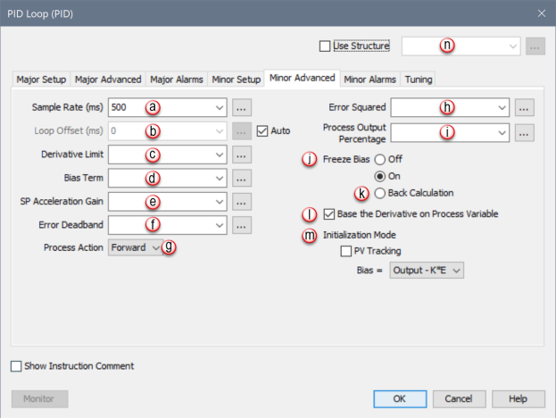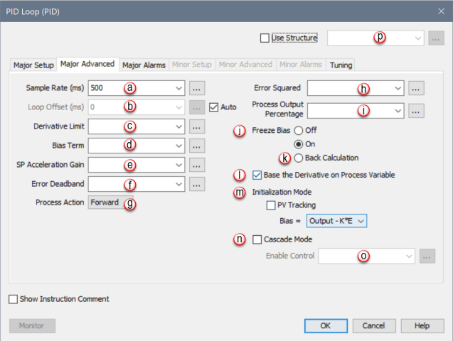 When PID Loop Instruction is selected the PID Loop Configuration window opens with the Major Setup Tab opened by default. Click on the Major Advanced Tab to see the Configuration options for Major Advanced shown below.