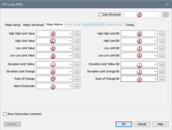 When PID Loop Instruction is selected the PID Loop Configuration window opens with the Major Setup Tab opened by default. Click on the Major Alarms Tab to see the Configuration options for Major Alarms shown below.