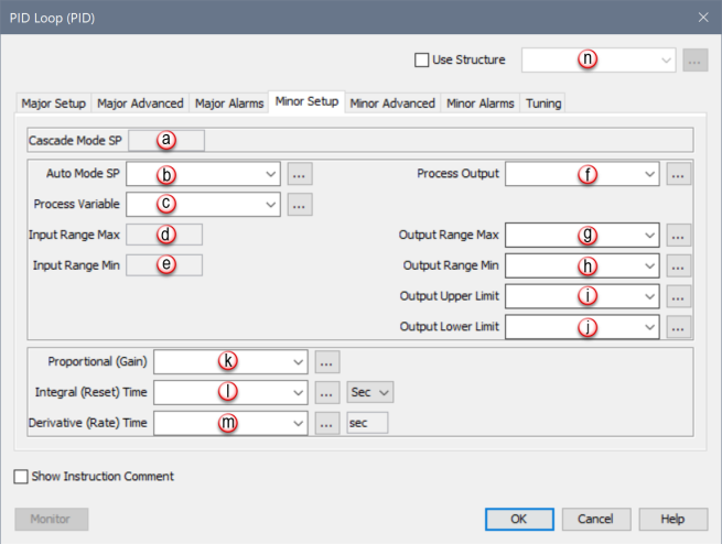 When PID Loop Instruction is selected, the PID Loop Configuration window opens with the Major Setup Tab opened by default. This Tab is only active when the Cascade Mode selection found in the Major Advanced Tab is selected. Therefore, select Cascade Mode first and then click on the Minor Setup Tab to see the Configuration options for Minor Setup shown below.