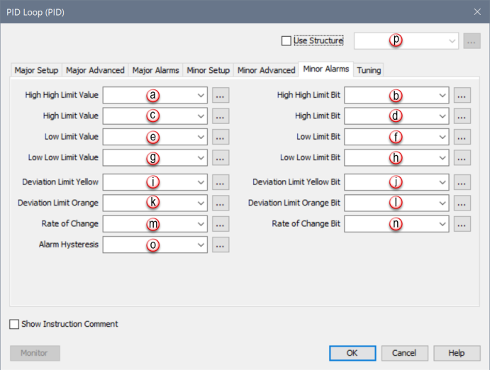 When PID Loop Instruction is selected the PID Loop Configuration window opens with the Major Setup Tab opened by default. The Minor Alarms Tab is only active when the Cascade Mode selection found in the Major Advanced Tab is selected. Therefore, select Cascade Mode first and then click on the Minor Alarms Tab to see the Configuration options for Minor Alarms shown below.