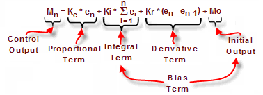 Detailed analysis of these equations will be found in most good textbooks on Process Control. At a glance, we can isolate the parts of the PID Algorithm that correspond to the P, I, and D terms, and the Bias as shown below.