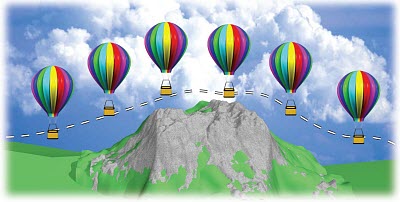The diagram below shows a hot-air balloon following a path across some mountains. The desired path is the Setpoint. The balloon pilot turns the burner ON and OFF alternately, which is his Control Output. The large mass of air in the balloon effectively averages the effect of the burner, converting the bursts of heat into a continuous effect: slowly hanging balloon temperature and ultimately the altitude, which is the Process Variable.
