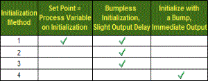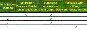 The Initial Output is the Output value assumed from Manual Mode control when the Loop transitions to Auto Mode. The sum of the Initial Output and the Integral Term is the Bias Term, which holds the Position of the Output.