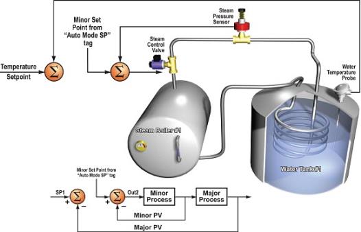 - In Cascade Mode both the Major and Minor Loops are calculated as a CombinedLoop. The Minor Loop set point is pulled from the Major Loop's Output as shown in the diagram below.