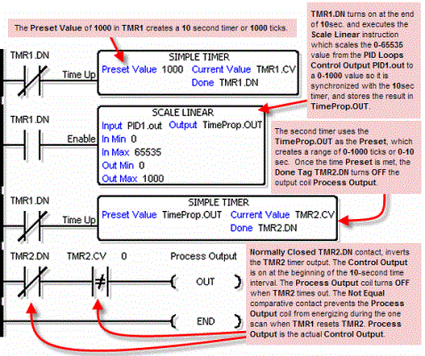 The example logic below shows how you would convert the smooth continuous Control signal from the PID Control Output to a pulsing Time-Proportioning Control for applications that require it.