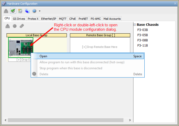 Configuration window. First select the Local Base Group from the Hardware Configuration window by double left-clicking the Local Base Group or by right-clicking the Local Base Group and selecting Open from the drop down menu as seen below.