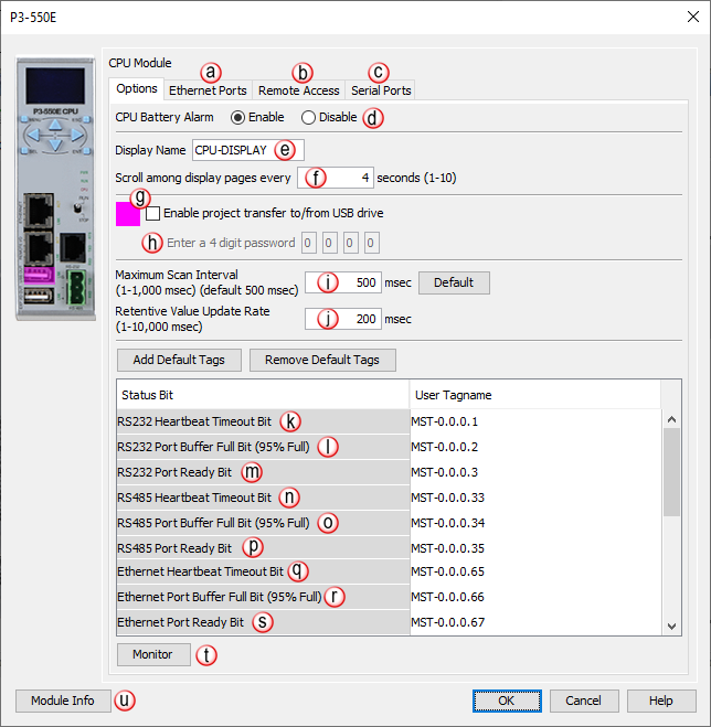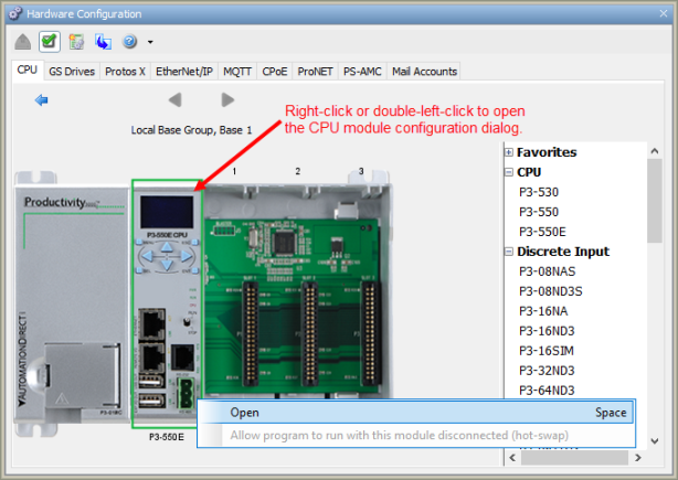 Then select the P3-550(E) by double left-clicking the CPU or by right-clicking the CPU and selecting Open from the drop down list. This will display the P3-550(E) configuration window.
