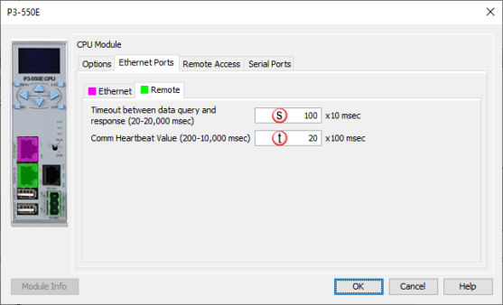 Heartbeat Timeout Bit: Becomes True if the Ethernet Comm Heartbeat Value of the Ethernet Ports configuration is exceeded, but only when the CPU ports are being used as a slave device. The CPU monitors the time between the communications from the master device and enables the Bit if a communication packet fails to be received by the CPU within the specified time.