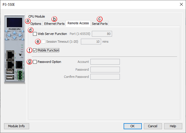 Password Option: Allows the user to set a password for Remote Access using the CPU Data App or access to the Web Server.