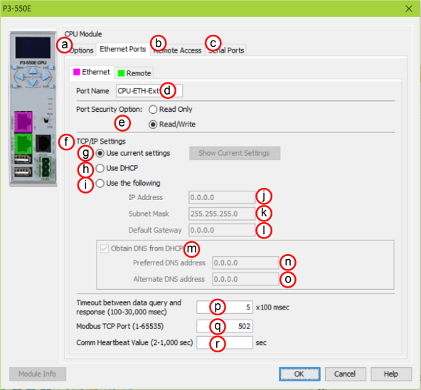 - The Settings can be saved as part of the project. This must be Enabled in the P3-550 Hardware Configuration Settings by selecting Use the Following (discussed on Item f below). If handled this way, the Settings stored in the project will take effect at Project Transfer and at boot up only. The Settings may be changed after boot up.