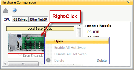 The Communications Port Configuration for any module containing communications ports is accessed from the Hardware Configuration window. For example, to access the P3-550 communications port configuration, first select the Local Base Group from the Hardware Configuration window by double left-clicking the Local Base Group or by right-clicking the Local Base Group and selecting Open from the drop down menu as seen below.